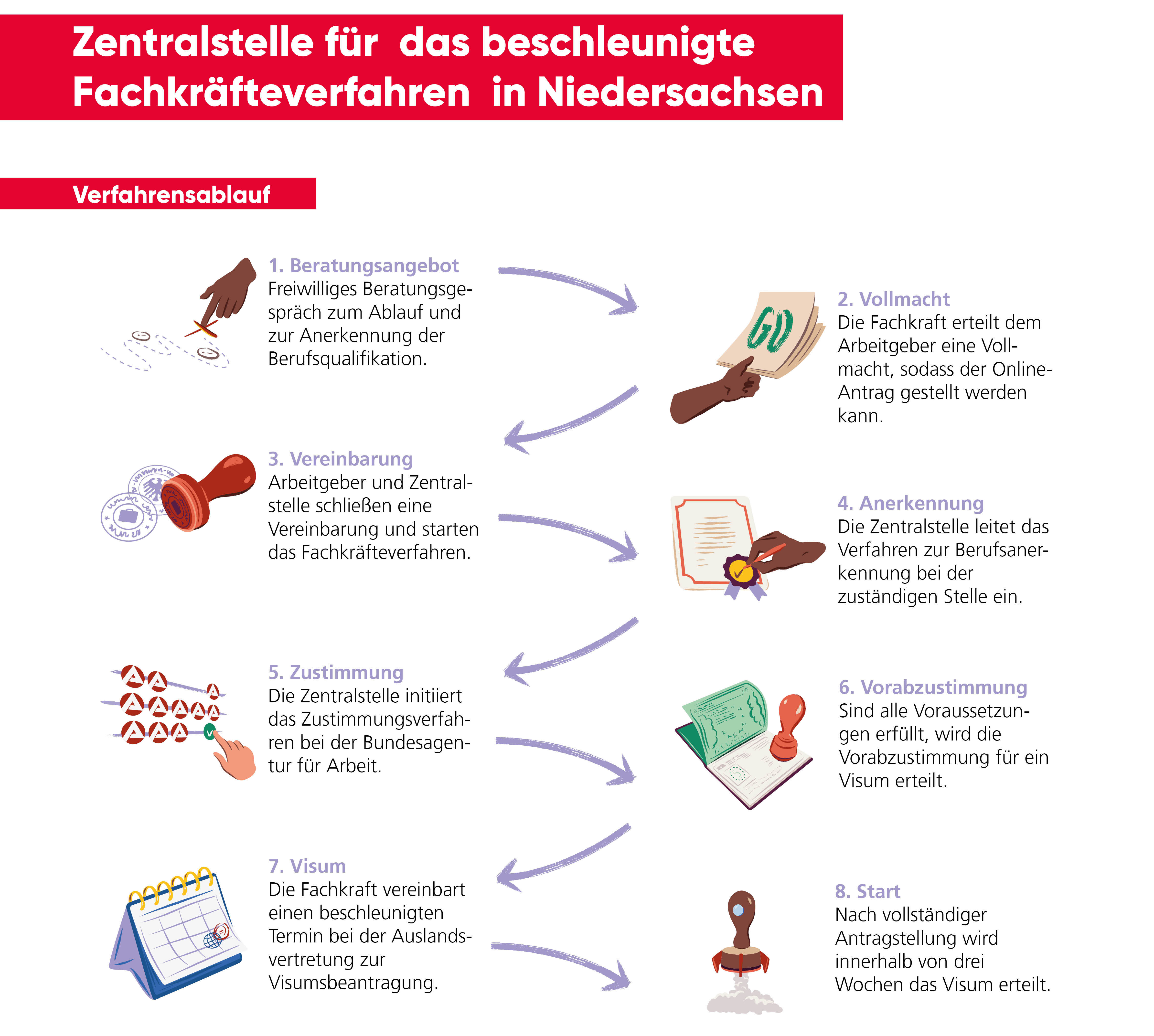 Das beschleunigte Fachkräfteverfahren beinhaltet kein Verwaltungsverfahren. Die Landesaufnahmebehörde Niedersachsen agiert hier als zentrale Verfahrensvermittlerin.